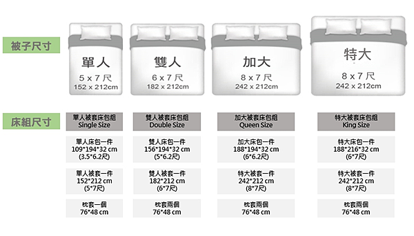 從單人、雙人、Queen size到King size各種尺寸的都有