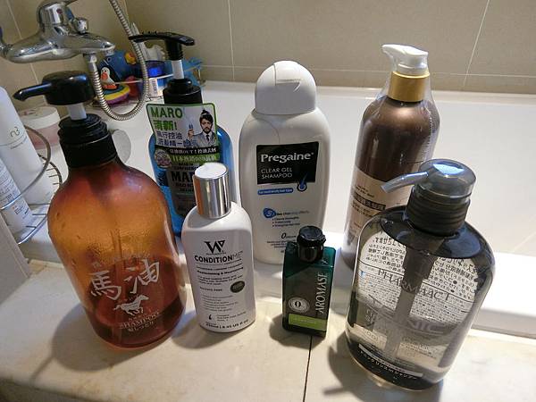 浴室裡常常擺上六七罐的洗髮用品 這些全來自張主播的研究跟試驗....