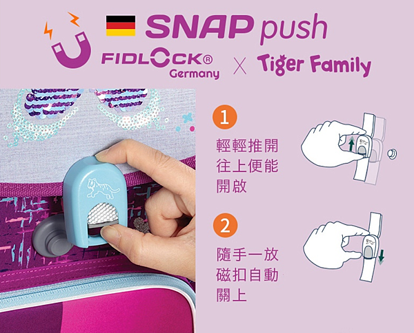 只要輕輕往上推壓就可以開啟 書包蓋上就自動吸住