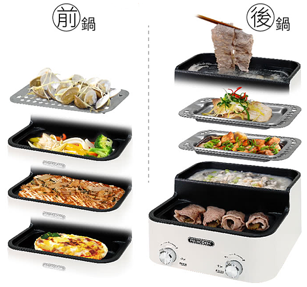 前後鍋都有獨立開關 還能夠搭配配件 並能再層疊烹煮