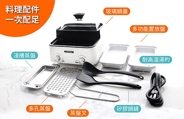 基本款配備有:即食鍋、多孔蒸盤、多功能置放盤*1、玻璃鍋蓋、蒸盤叉、電源線、使用說明書。