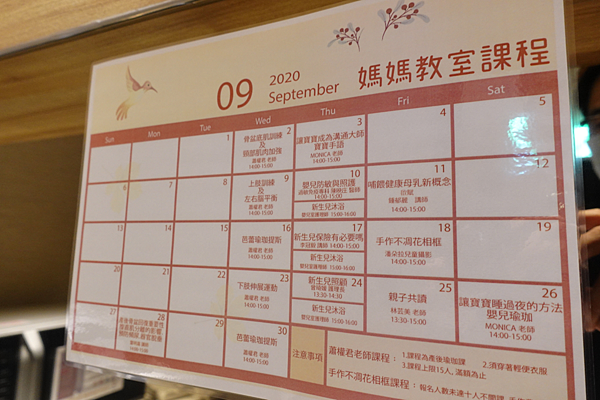 媽媽教室的課程表每個月都會更新 一樓跟共用茶水間都有貼