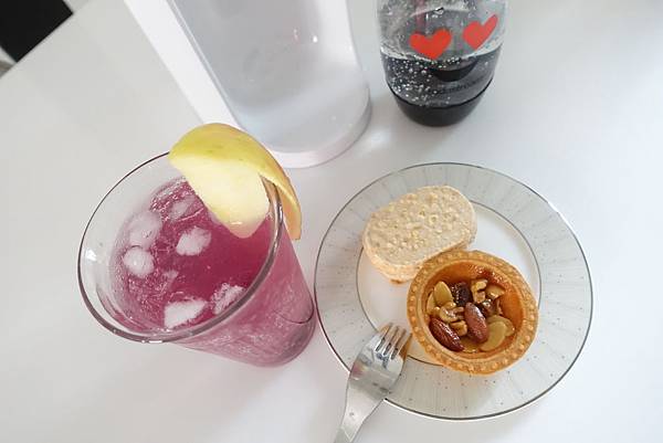 氣泡水喝起來蠻有解膩的效果的 淡淡的藍莓香氣加上不過甜的氣泡飲