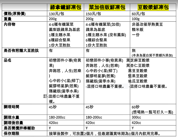 同綠拿鐵鮮凍包口味,但有機葉菜量多一倍,鳳梨因為含糖量較高所以去除。